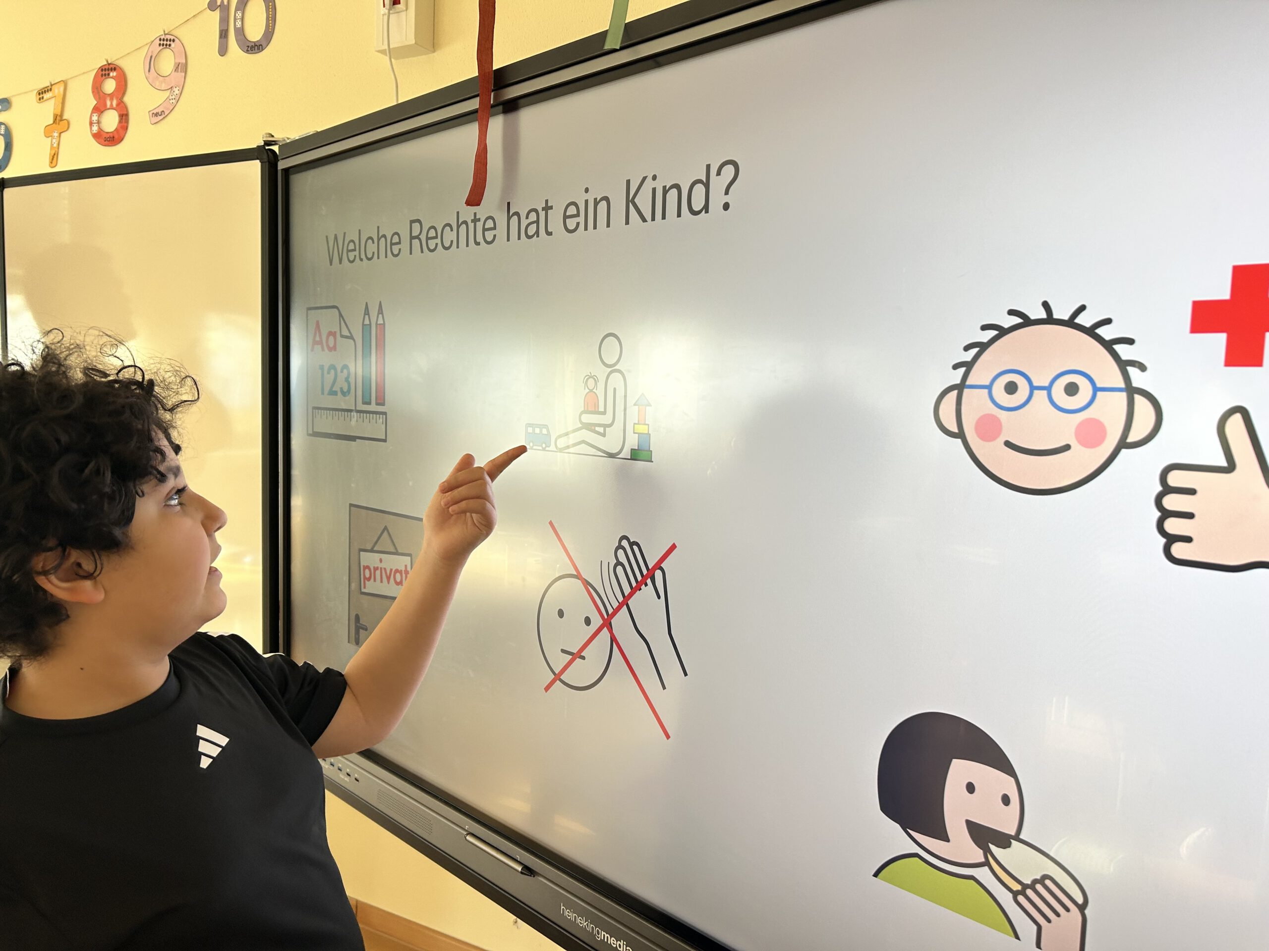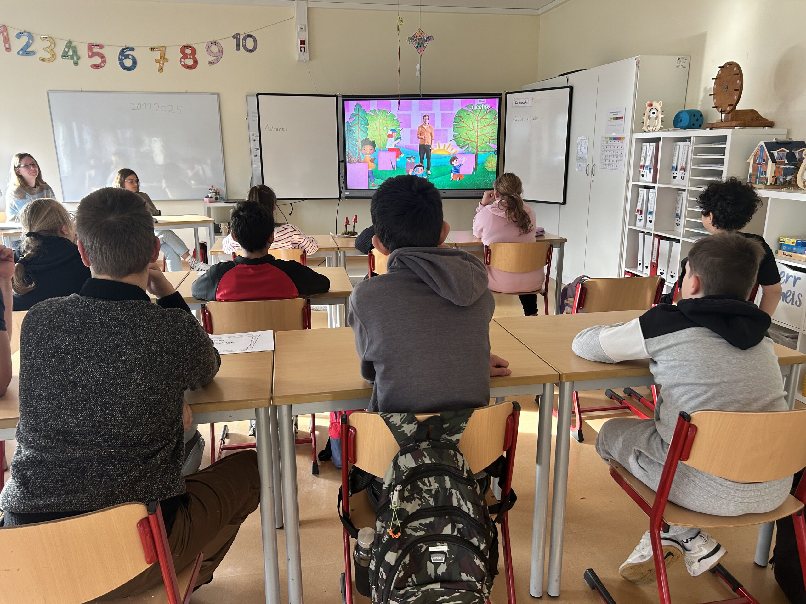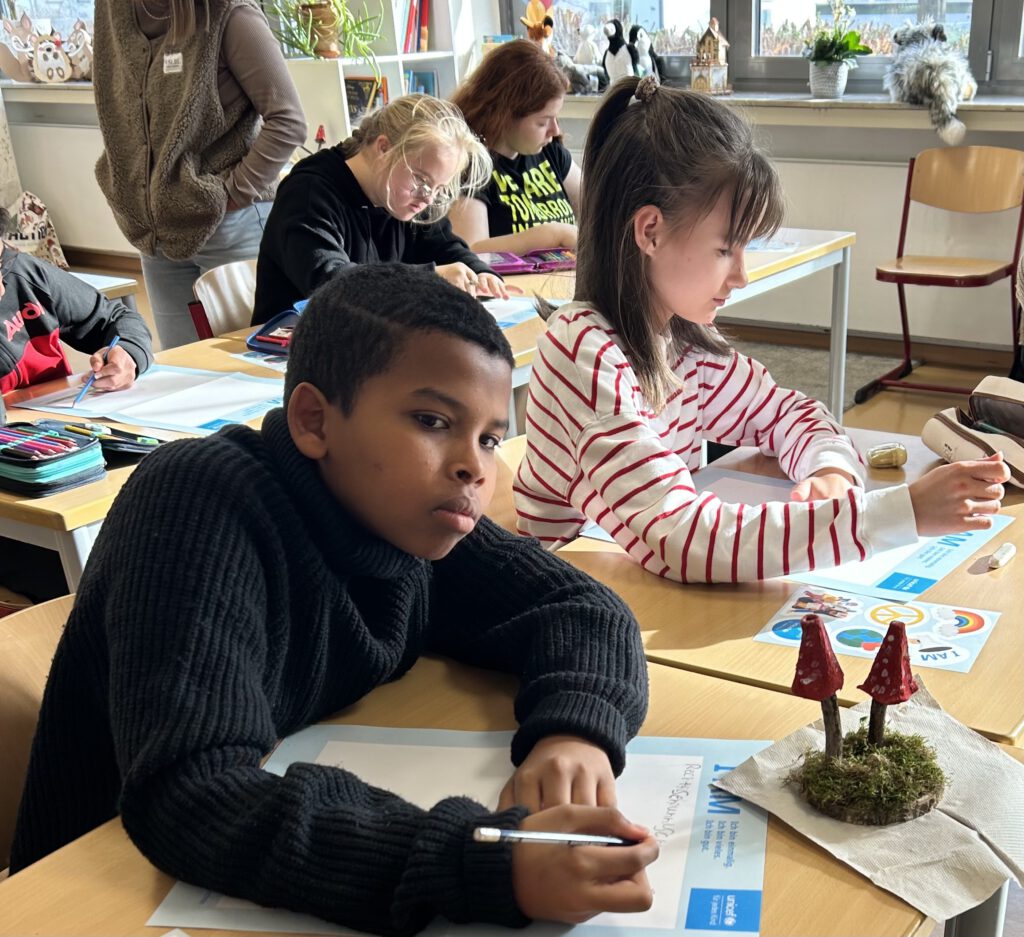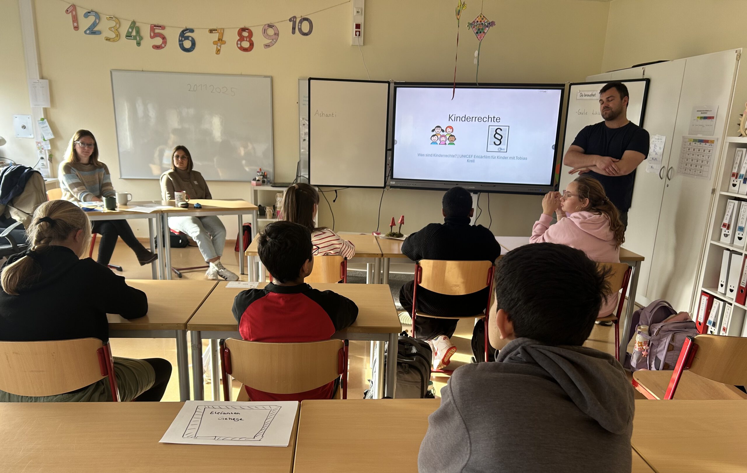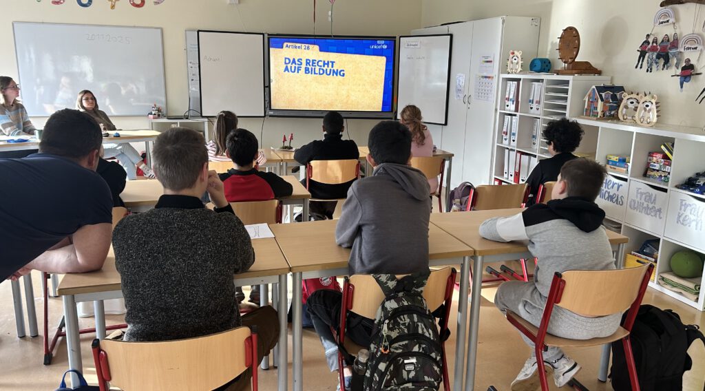 Anschließend schauten die Klassen ein kindgerechtes Erklärvideo von Checker Tobi und Unicef. In einer Präsentation wurden im Anschluss die Inhalte vertieft und verständlich aufgearbeitet, sodass die Schüler einen klaren Überblick über die wichtigsten Kinderrechte erhielten.