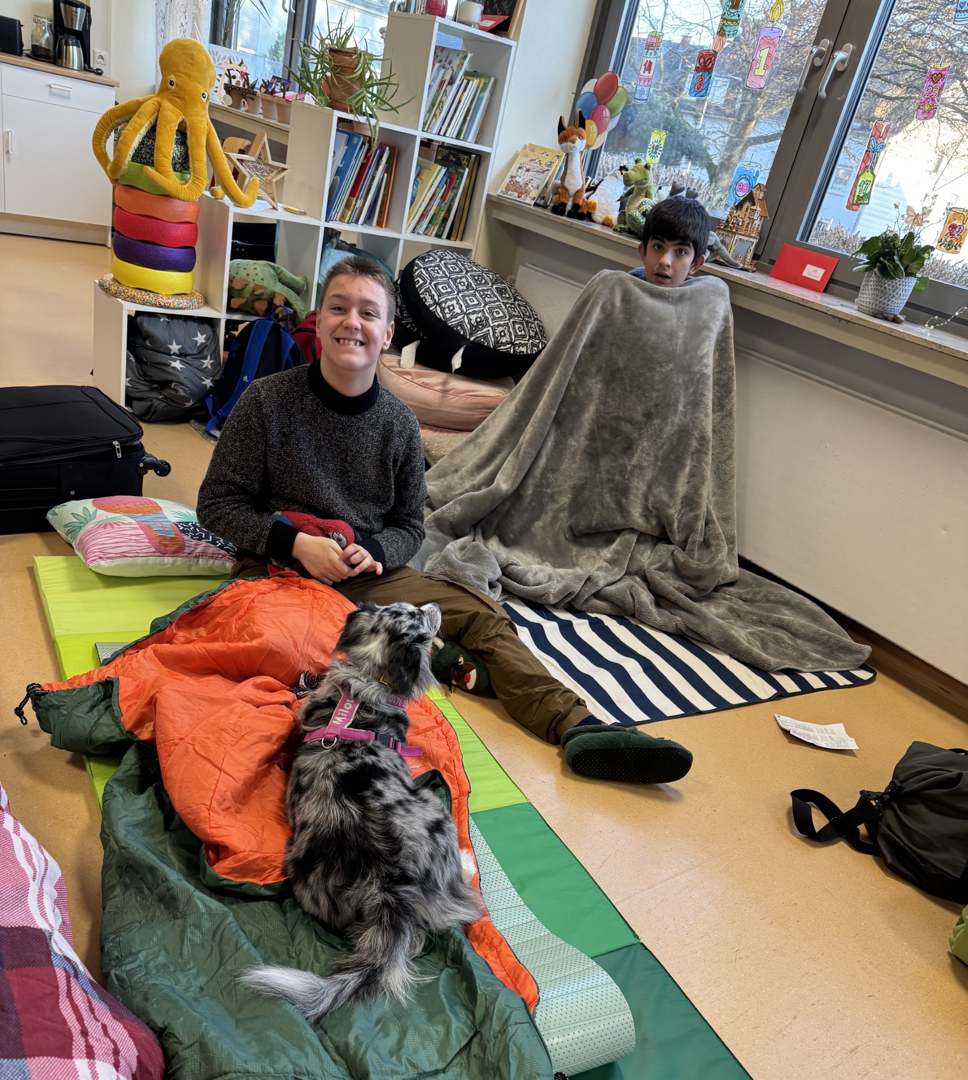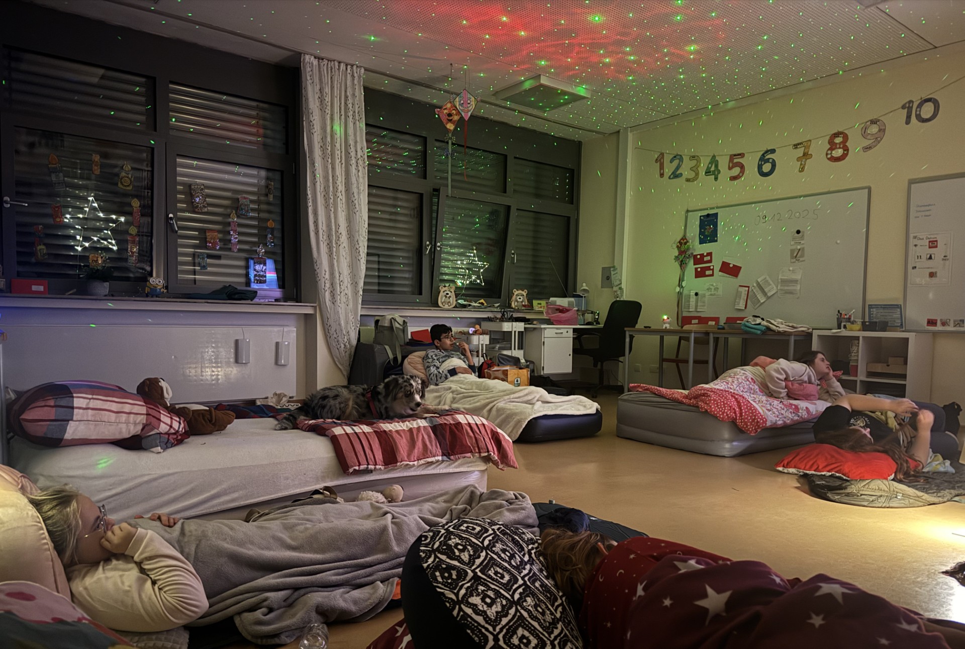 Am Nachmittag kehrten wir zurück zur Schule, wo die eigentliche Übernachtung begann. Die Schüler richteten ein gemütliches Matratzenlager ein und bereiteten sich auf die Pyjamaparty vor. So wurde schon mal das Bett für die Nacht ausprobiert, gesungen, getanzt und gelacht. Natürlich wurde auch das leere Schulgebäude für eine Runde Verstecken spielen genutzt. Mit einer Taschenlampe ausgestattet suchte sich jeder Schüler ein tolles Versteck.