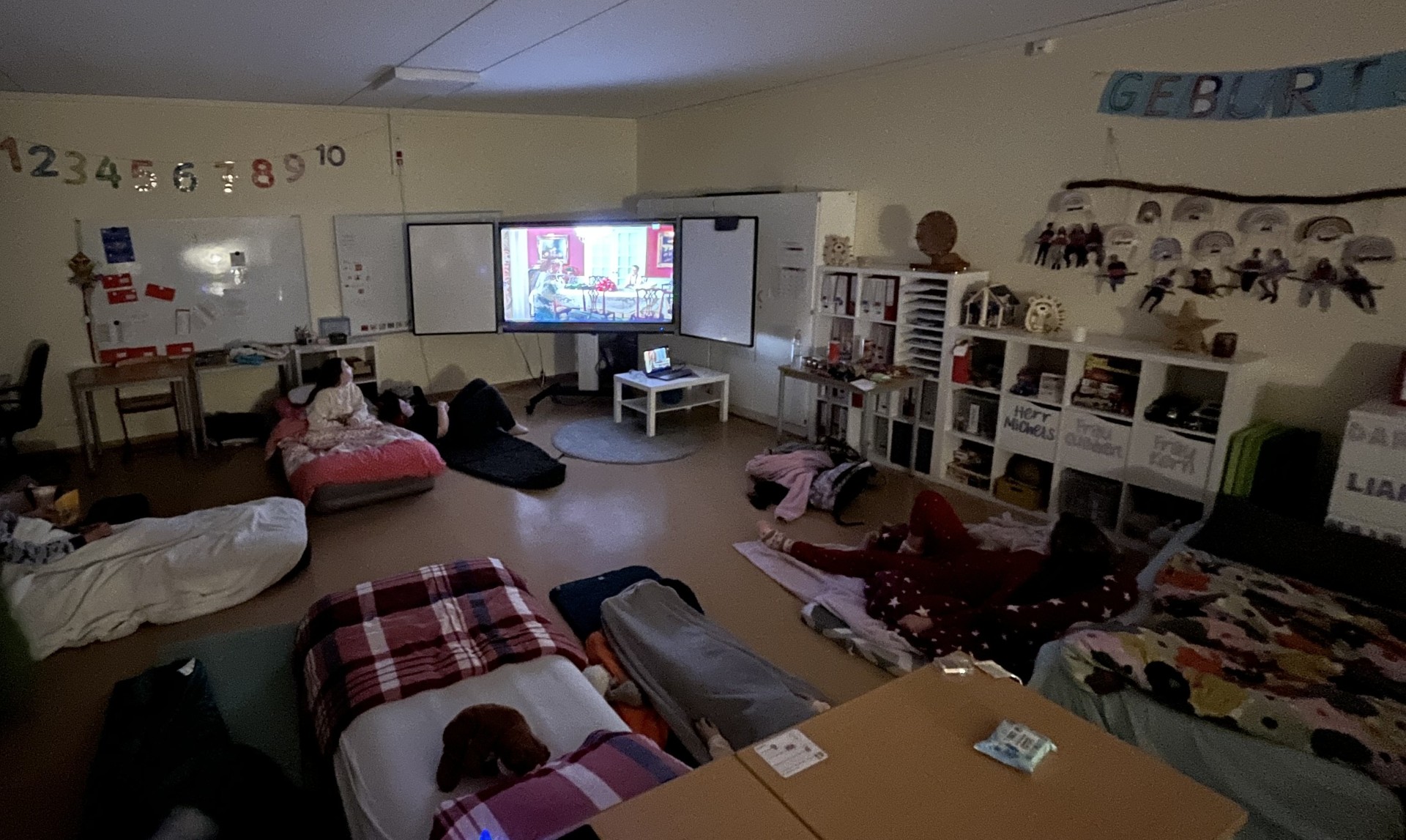 Ein besonderes Highlight des Abends war das gemeinsame Anschauen des Films „Kevin – Allein zu Haus“. Mit Gesichtsmasken, tollen Gesprächen und viel Gelächter wurde der Abend zu einem tollen Erlebnis, das die Klassengemeinschaft stärkte.