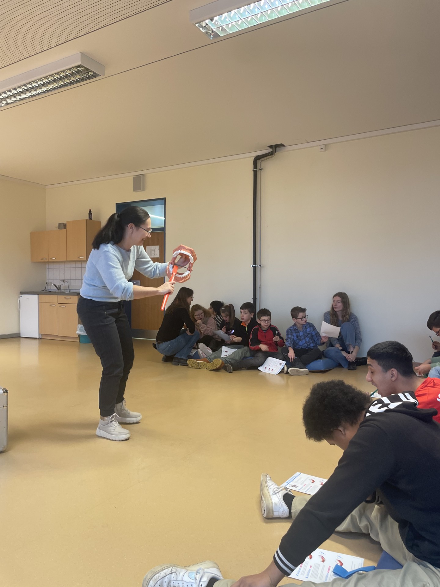 Im Anschluss durften die Schülerinnen und Schüler das Gelernte direkt umsetzen. Nach einer Trockenübung erhielt jedes Kind eine Zahnbürste geschenkt, und gemeinsam wurde das richtige Zähneputzen geübt. Anschaulich erklärt wurde dies mithilfe eines großen Zahnmodells und einer überdimensionalen Zahnbürste durch die Zahnarzthelferin, die den Vortrag leitete.