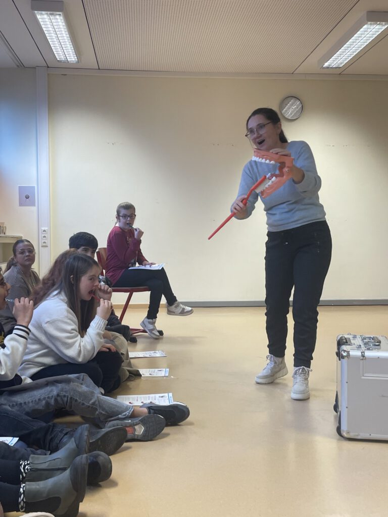 Besonders begeistert waren die Schülerinnen und Schüler von der anschließenden Fragerunde, in der sie ihre eigenen Fragen stellen konnten und viele hilfreiche Tipps rund um Zahnpflege und Zahngesundheit erhielten.