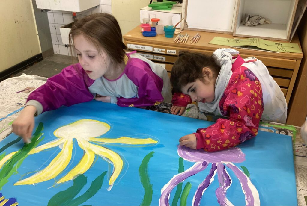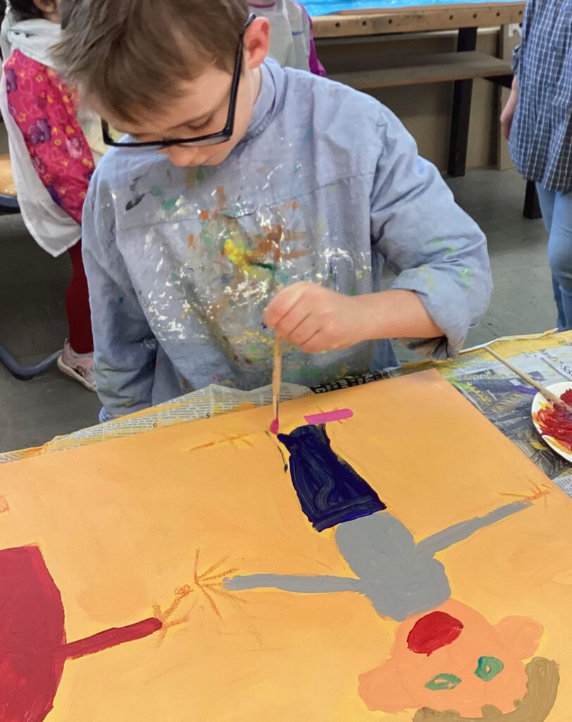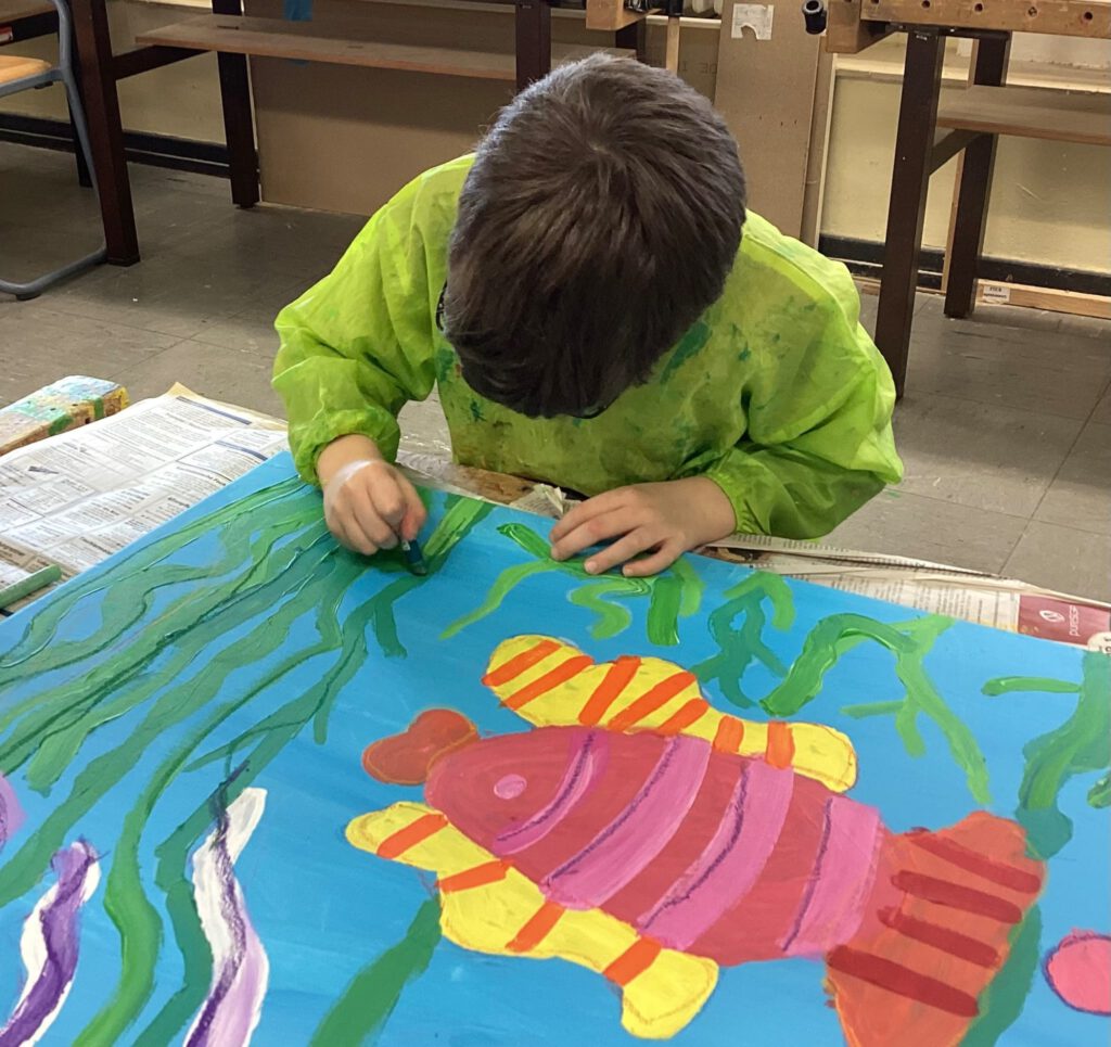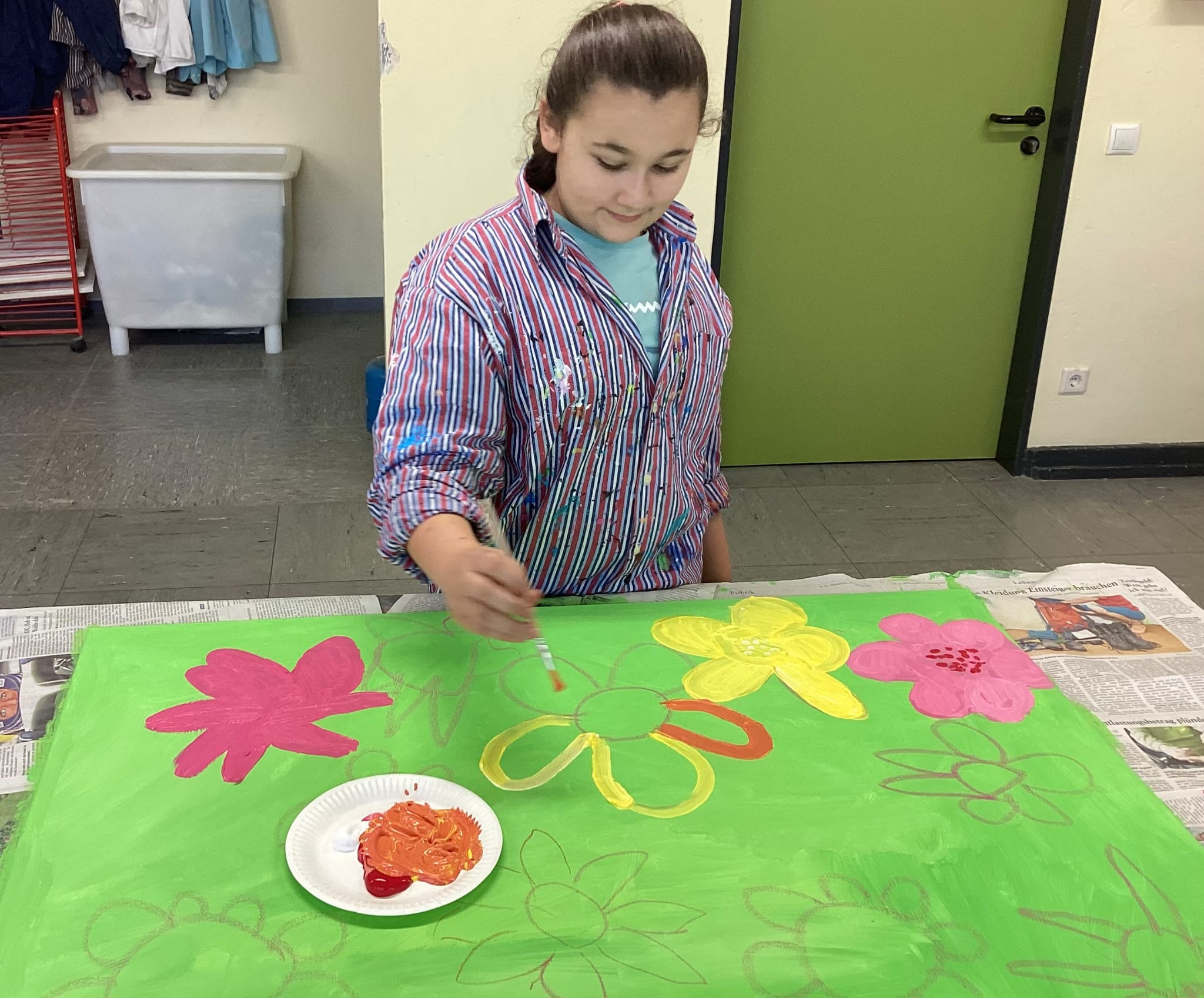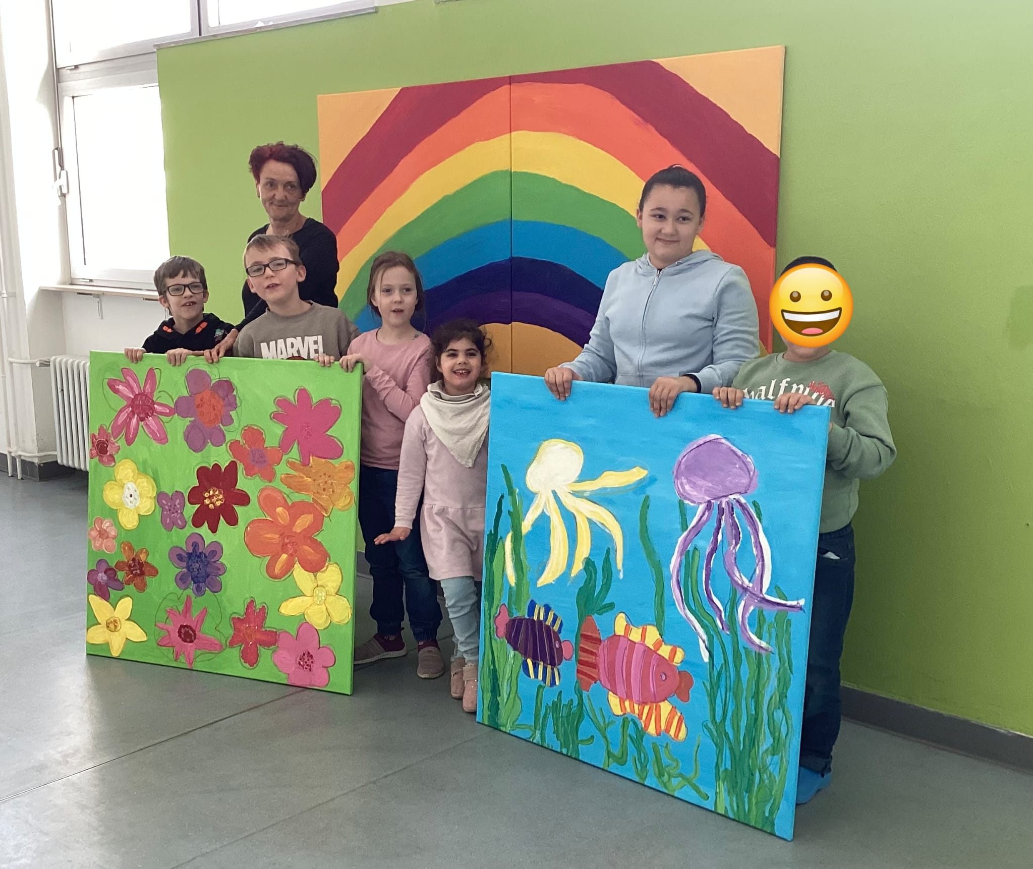 Eine Woche lang wurde im Werkraum kreativ gearbeitet. Mit bunten Acrylfarben gestalteten die Kinder insgesamt neun großformatige Leinwände. Dabei entstanden farbenfrohe Bilder mit verschiedenen Motiven, wie z.B. eine Blumenwiese, eine Unterwasserwelt und ein Regenbogen, den sich die Kinder ausdrücklich gewünscht hatten.