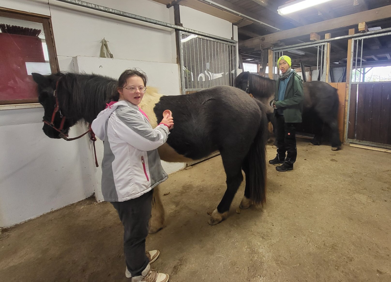 Sie üben den Pferden ein Halfter anzuziehen und sie zu führen. Bei der Körperpflege der Pferde helfen die Schüler sie zu bürsten und zu striegeln, sowie sie in die Solekammer oder unter das Rotlicht zu bringen.