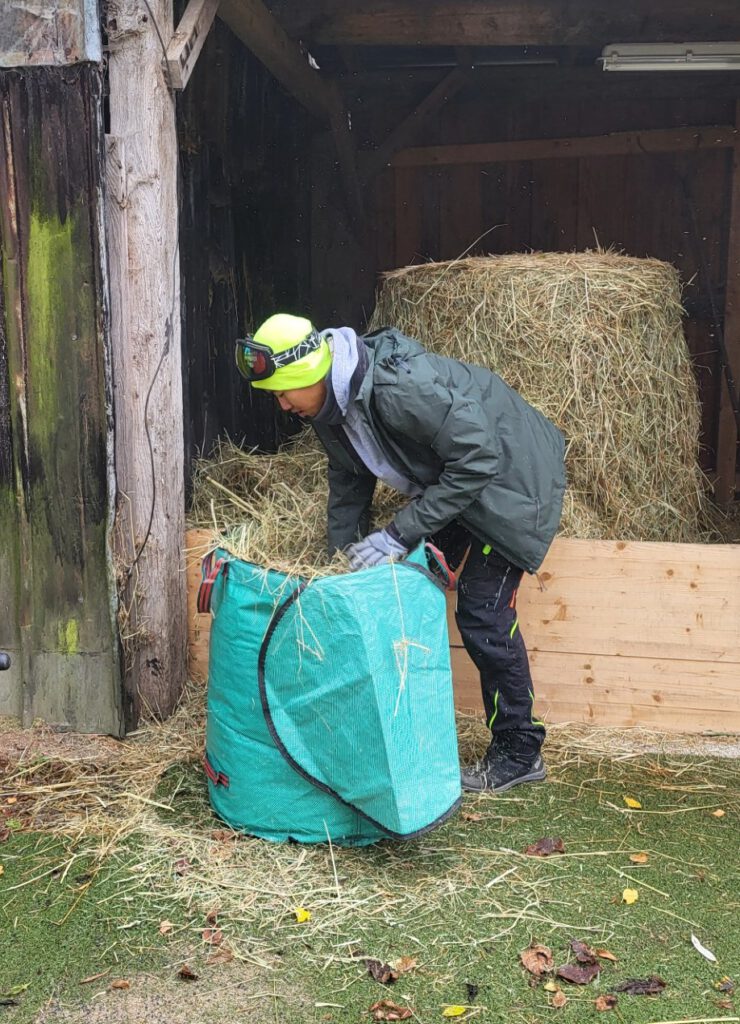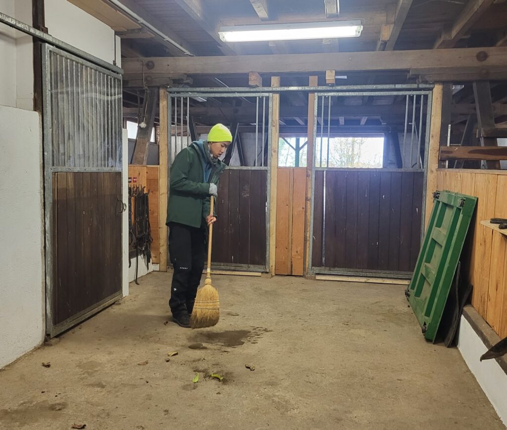 Natürlich gibt es auch viele Aufgaben zum Sauberhalten von Hof, Stall und Paddock, die auf einem Pferdehof erledigt werden müssen, wie zum Beispiel das Säubern des Paddocks und das Kehren von Putzplatz und Hof. Das Rasentraktorfahren gehört hier zu den beliebtesten Aufgaben.