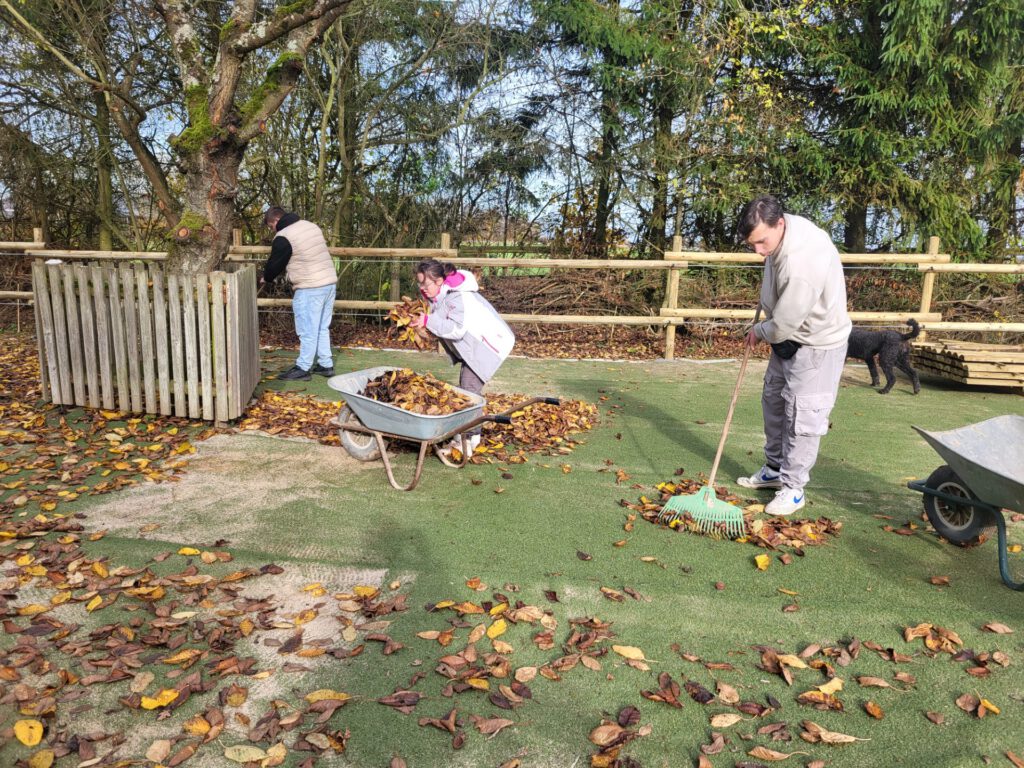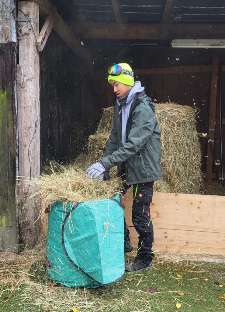 Die Schüler haben gelernt sich auf dem Hofgelände zu orientieren und dürfen dort einzelne Aufgaben übernehmen, die sie je nach ihren Fähigkeiten mit oder ohne Hilfe bewältigen können.